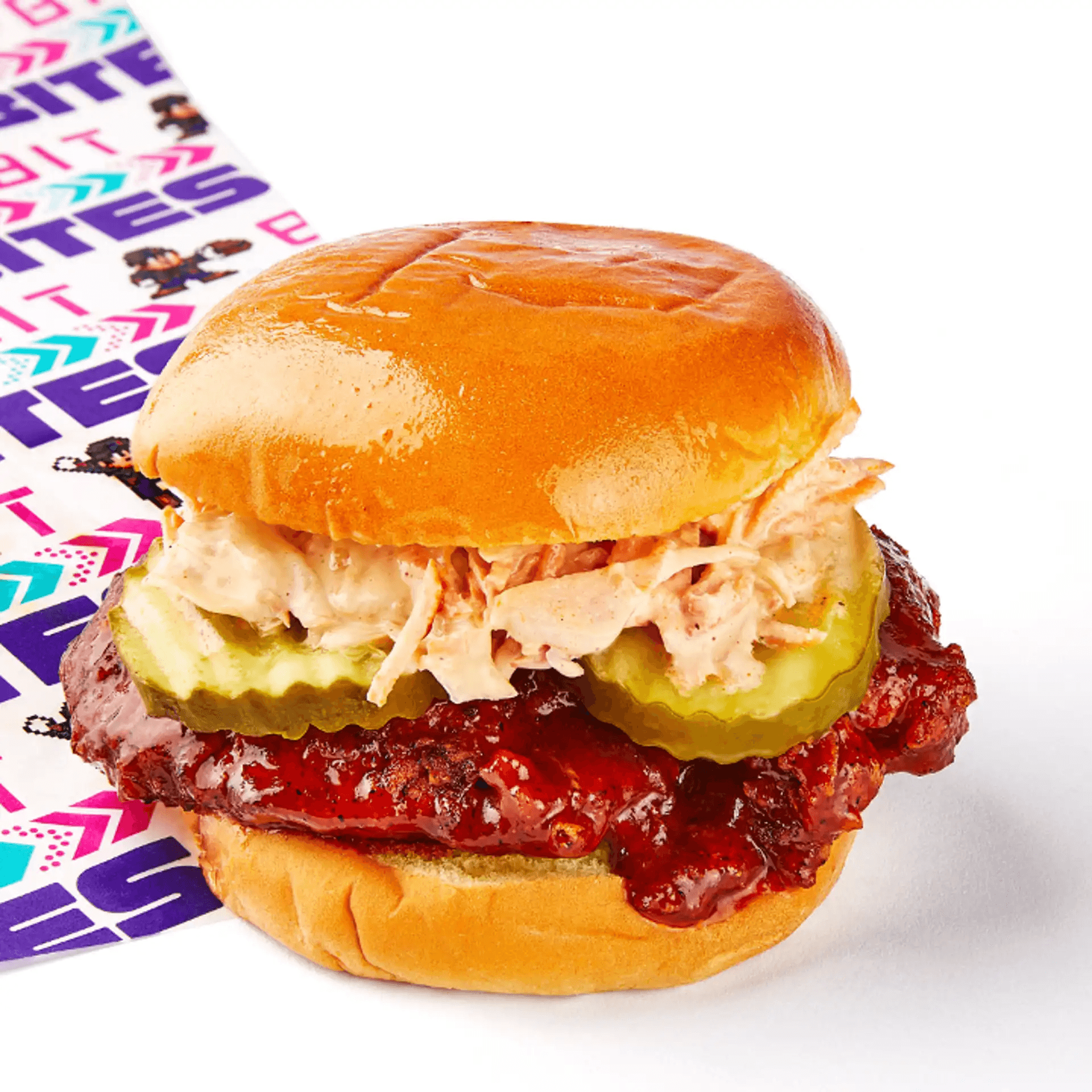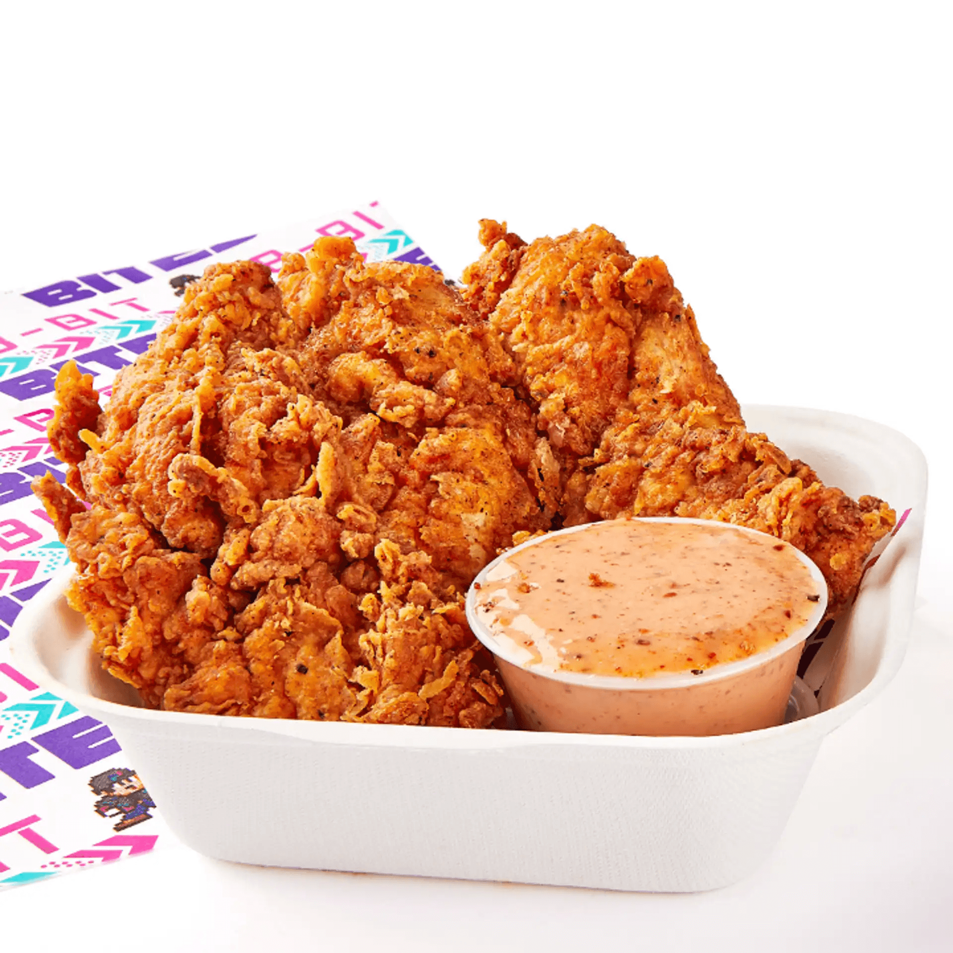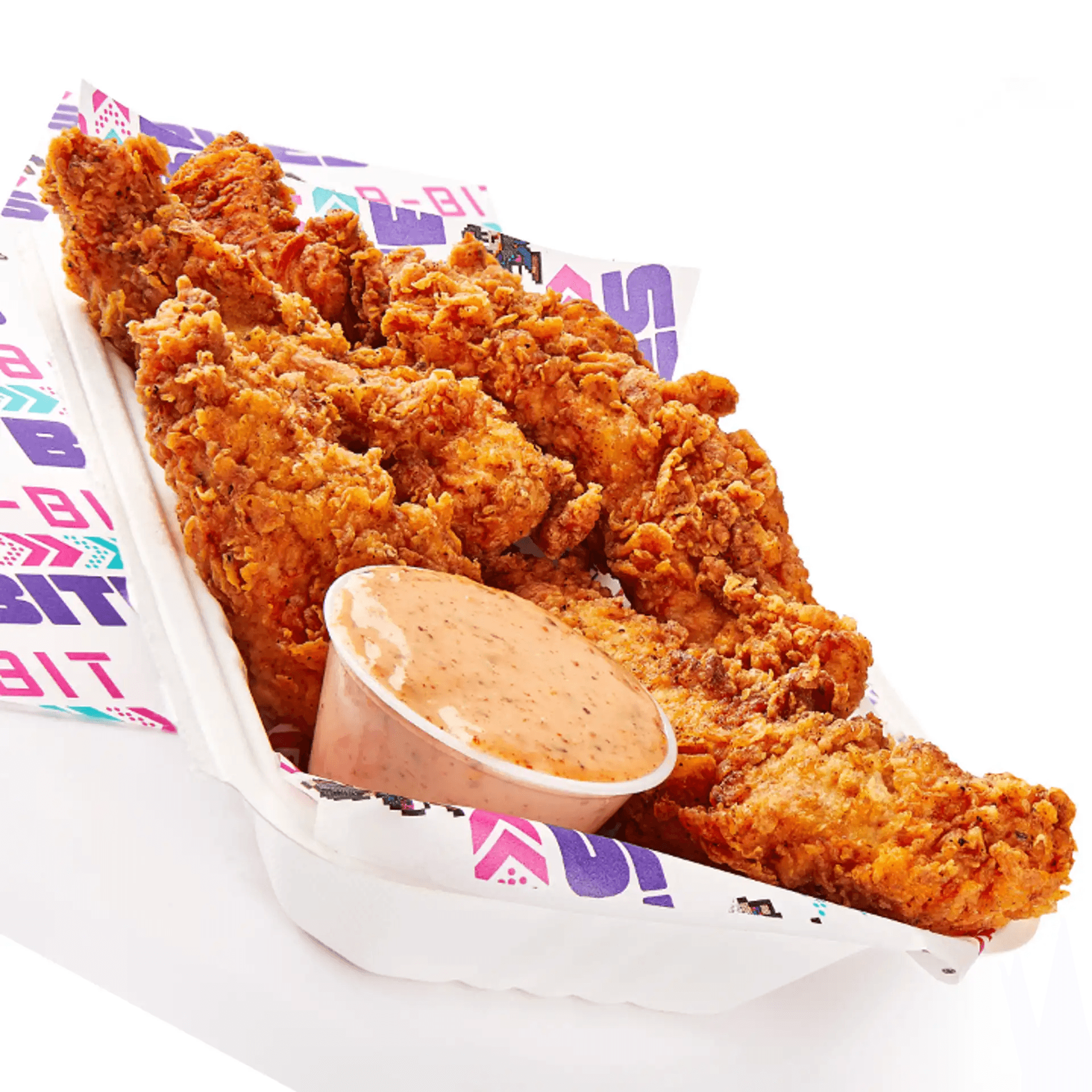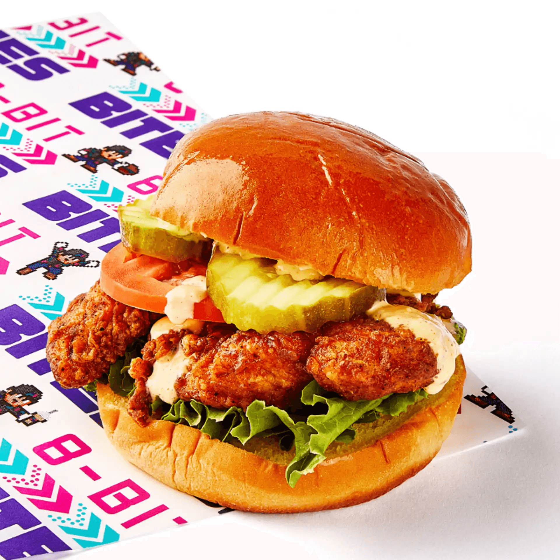 Crispy Chicken Tenderloin Breast Spiced with our own special mesquite blend & topped with Lettuce, Tomato, Pickle & 8-Bit Sauce.
