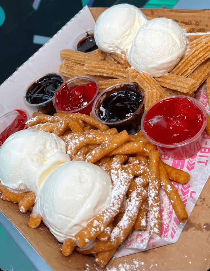 A Sweet Box chock full of Churros, Funnel Fries, Chocolate Sauce Cups, Strawberry Topping Cups, all topped off with Big Scoops of Vanilla Ice Cream!