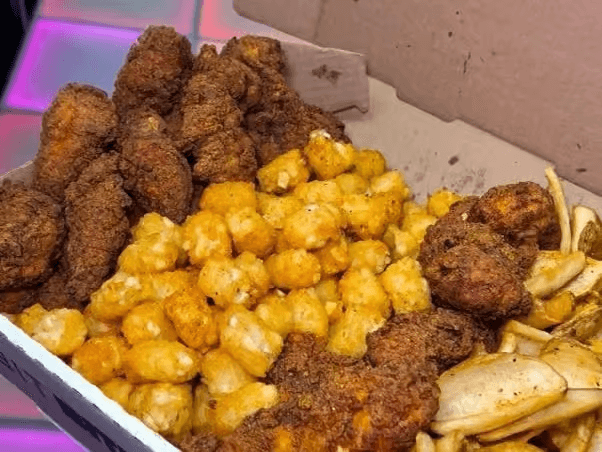 10 Tenders, 20 Boneless Wings, Tater Tots, Fries, Cheese Sauce, 1 Cup of Each Tossing and Dipping Sauce, and 6 Cans of Soda.