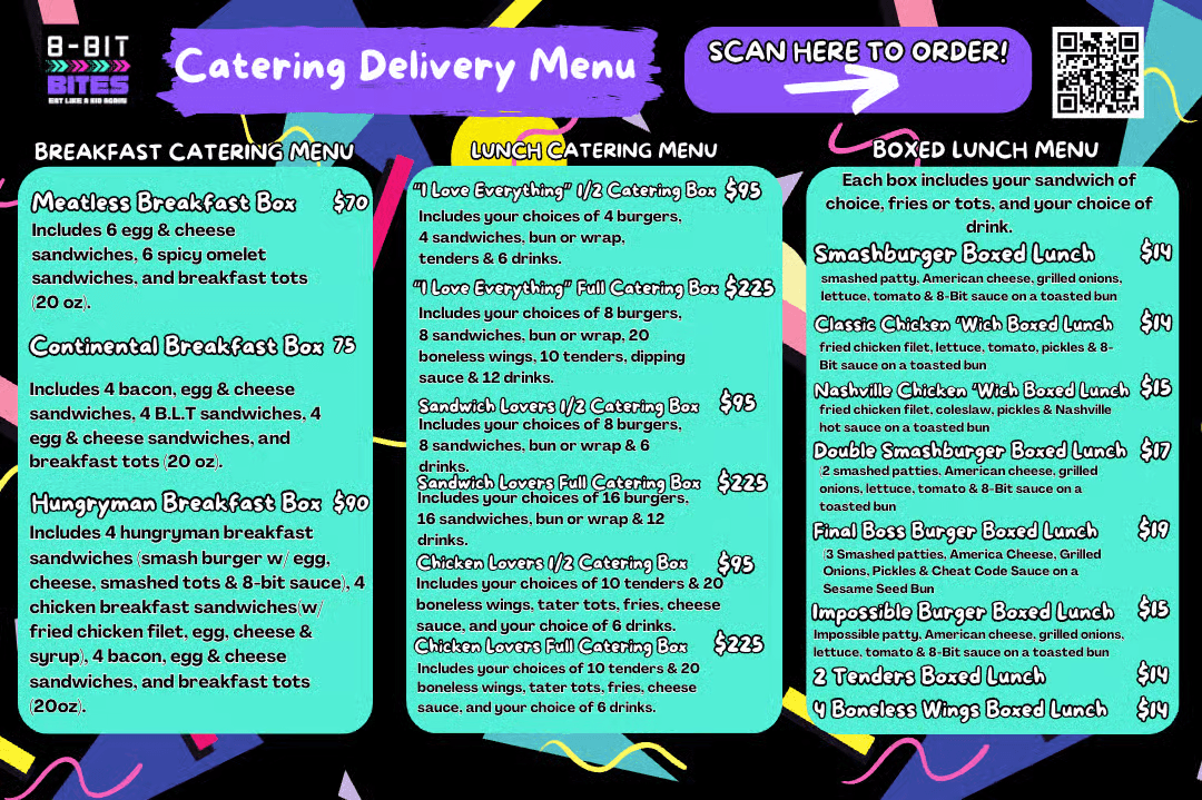 At 8 Bit Bites, we serve bold flavors with a nostalgic spin. Our menu is fully Halal and packed with smash burgers, fried chicken sandwiches, tenders, wings, loaded sides, tots, and shakes, all inspired by the energy of the 80s and 90s. It is food that feels fun, satisfying, and made for anyone who still eats with childhood joy.